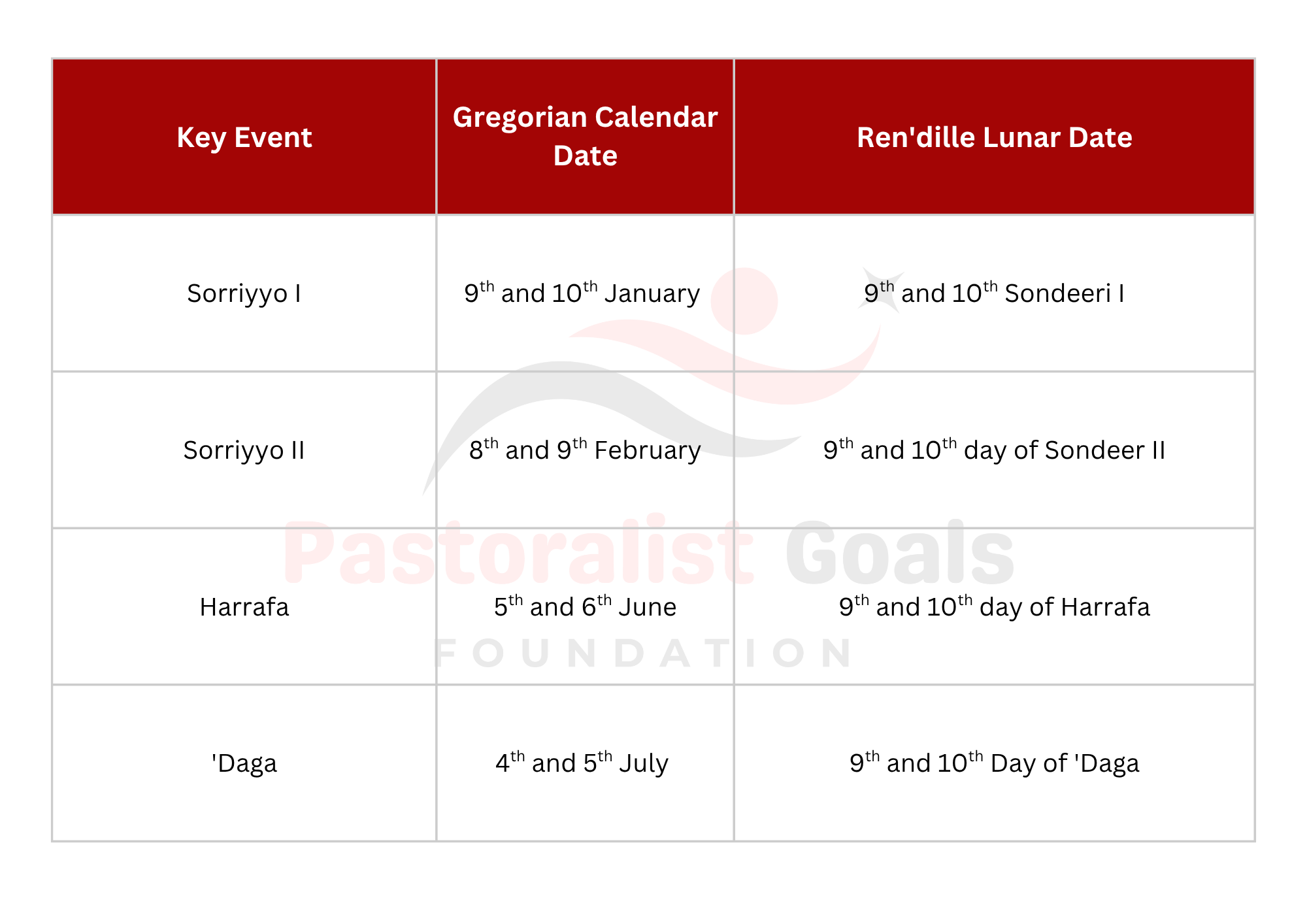 The Ren’dille community has their own unique calendar that is based on the phases of the moon ( Lunar Calendar). The calendar is used to to determine the dates of cultural events eg Sorriyyo, weddings, shaving ceremonies etc. The calendar is based on 12 lunar months – a new month begins when a new moon is sighted.